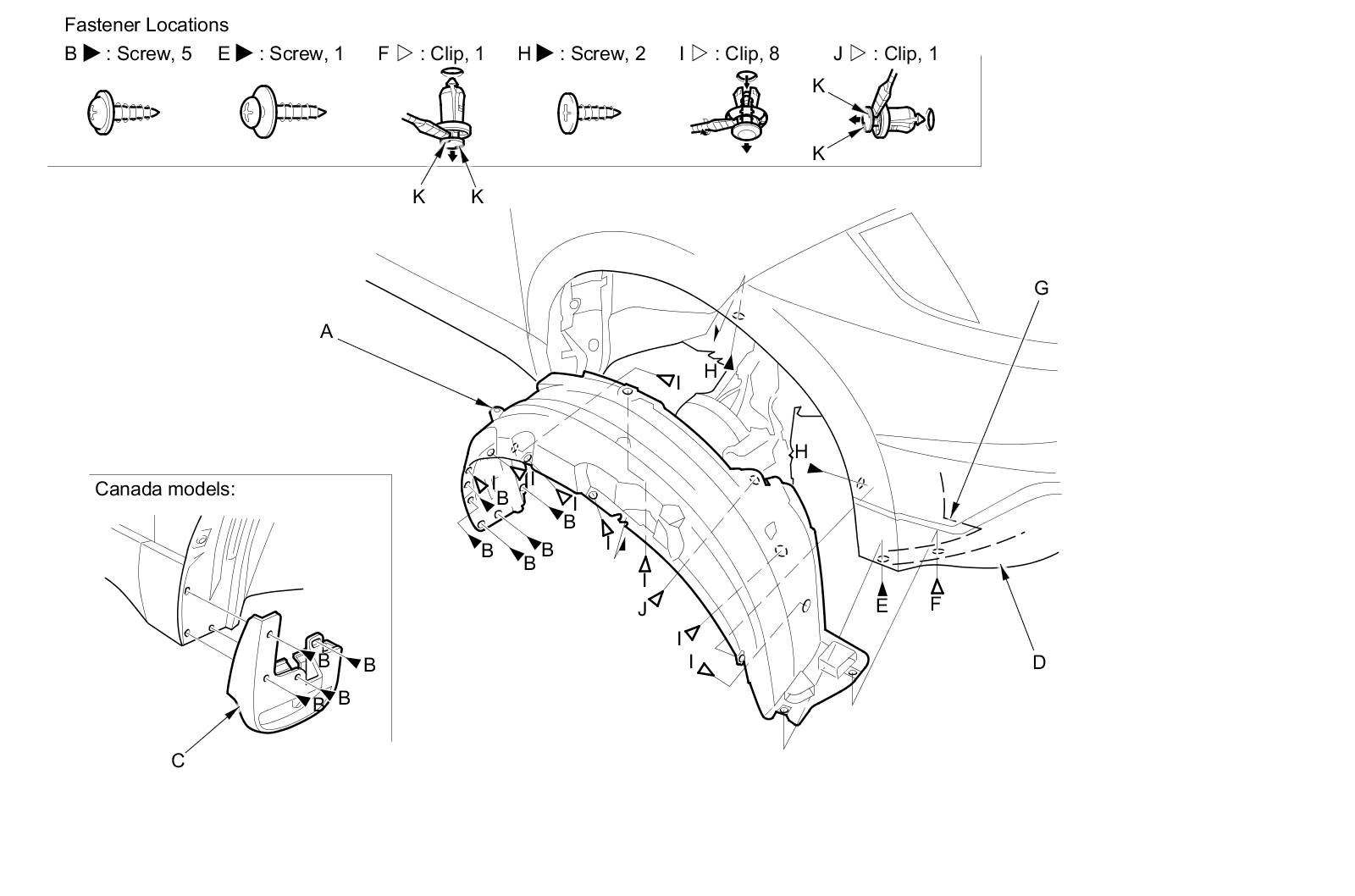4. From the wheel arch, remove the clips (I, J) securing the front inner fender (and the splash shield) to the body.