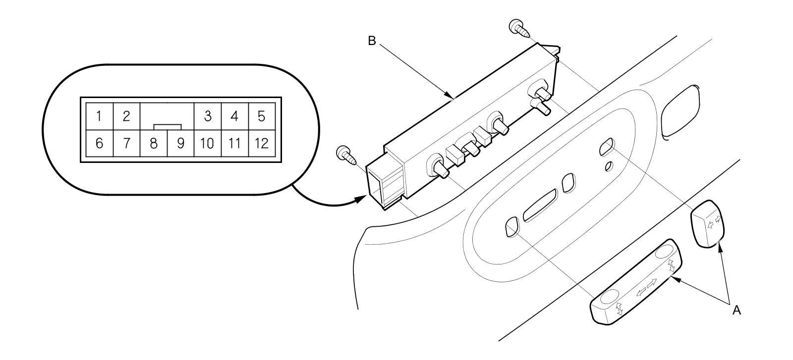 1. Remove the power seat adjustment switch knobs (A) and the recline cover from the driver's power seat Front Seat Cushion Cover/Pad Replacement, then remove the two screws and the power seat adjustment switch (B).