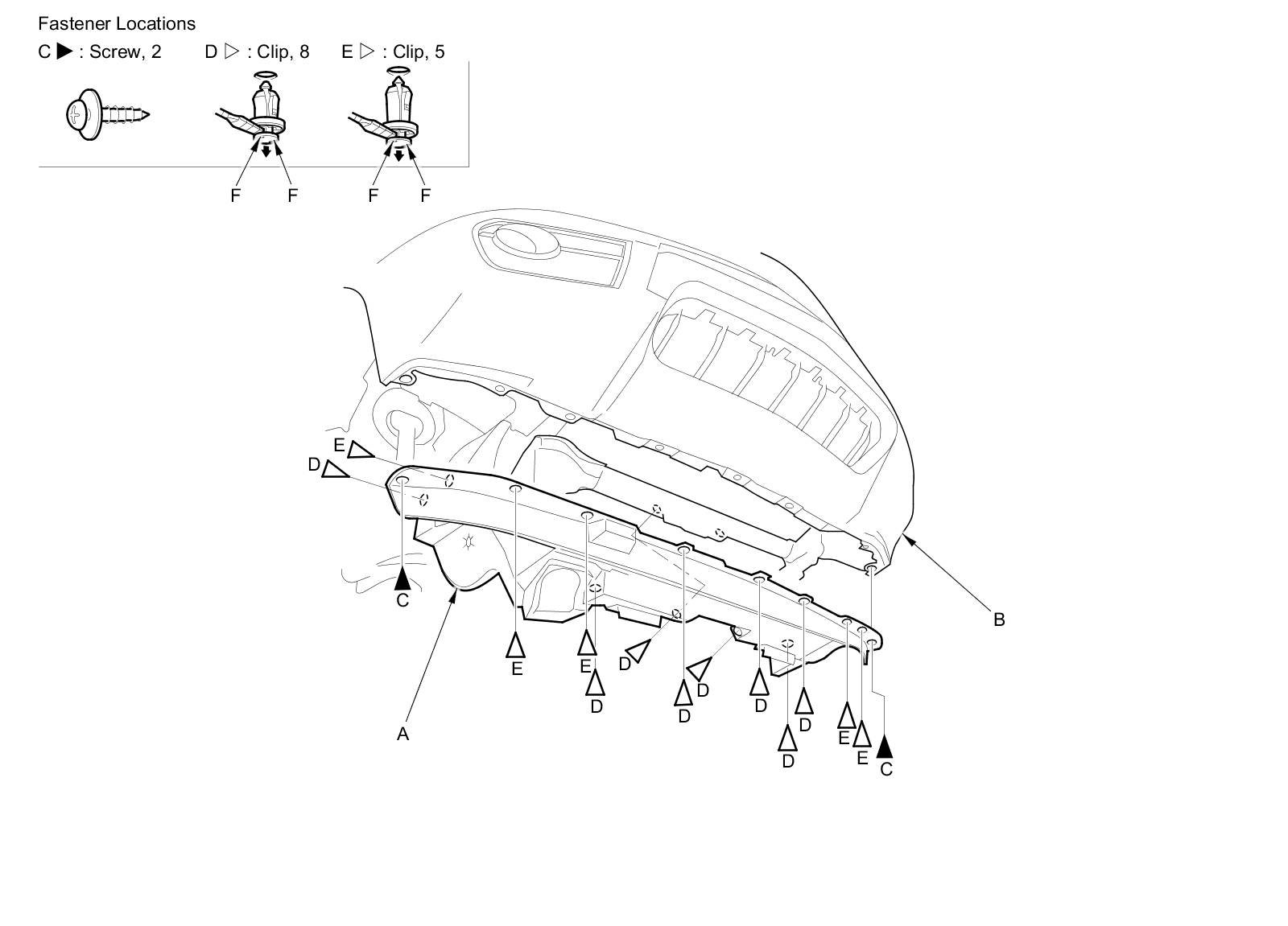 2. From under the body, remove the clips (D, E).