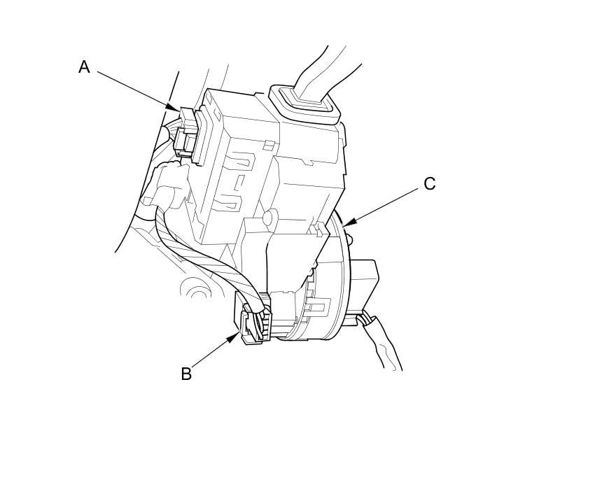 3. Disconnect the combination light switch 12P connector (A) and the steering angle sensor 5P connector (B) from the combination switch assembly/cable reel (C).