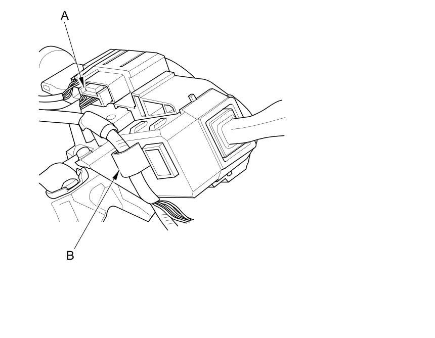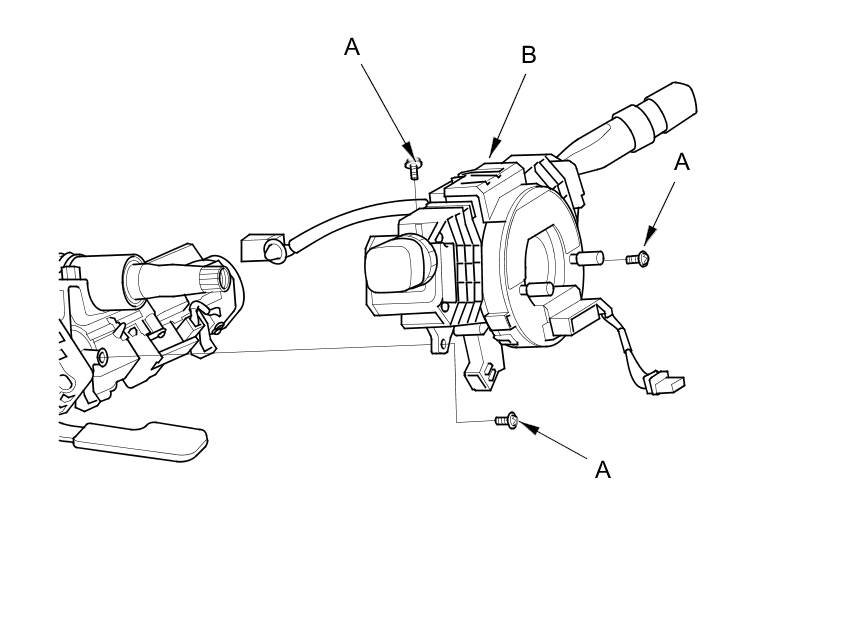 7. Remove the combination switch assembly/cable reel mounting screws (A), then remove the combination switch assembly/cable reel (B) from the steering column.
