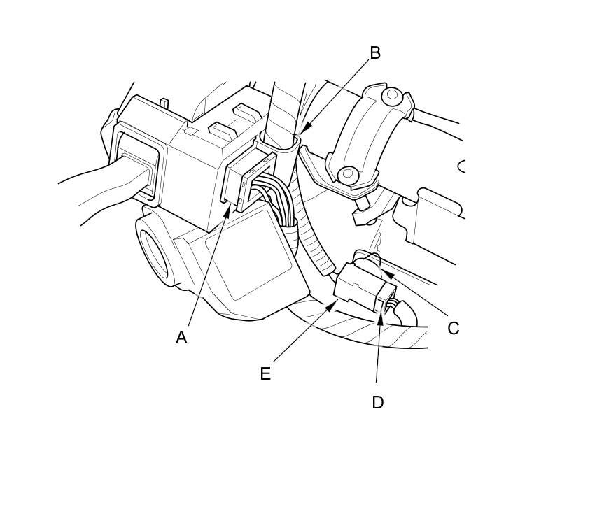 6. Remove the harness clip (C), then disconnect the dashboard wire harness 4P connector (D) from the cable reel 4P connector (E).