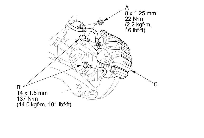4. Remove the brake caliper bracket mounting bolts (B), then remove the caliper assembly (C) from the knuckle. To prevent damage to the caliper assembly or the brake hose, use a short piece of wire to hang the caliper assembly from the undercarriage. Do not twist the brake hose excessively.