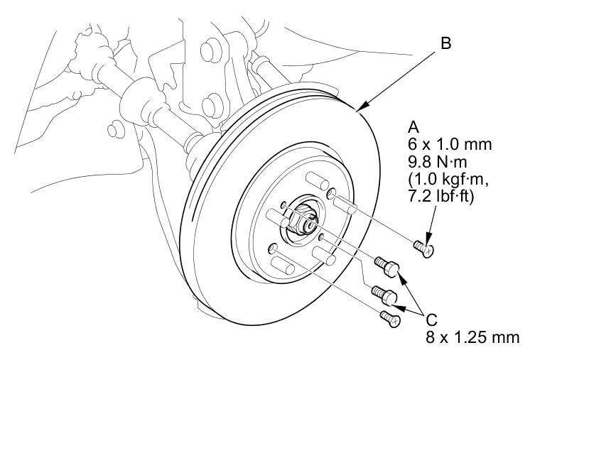 NOTE: If the brake disc is stuck to the front hub, thread two 8 x 1.25 mm bolts (C) into the brake disc to push it away from the front hub. Turn each bolt 90 degrees at a time to prevent the brake disc from binding.