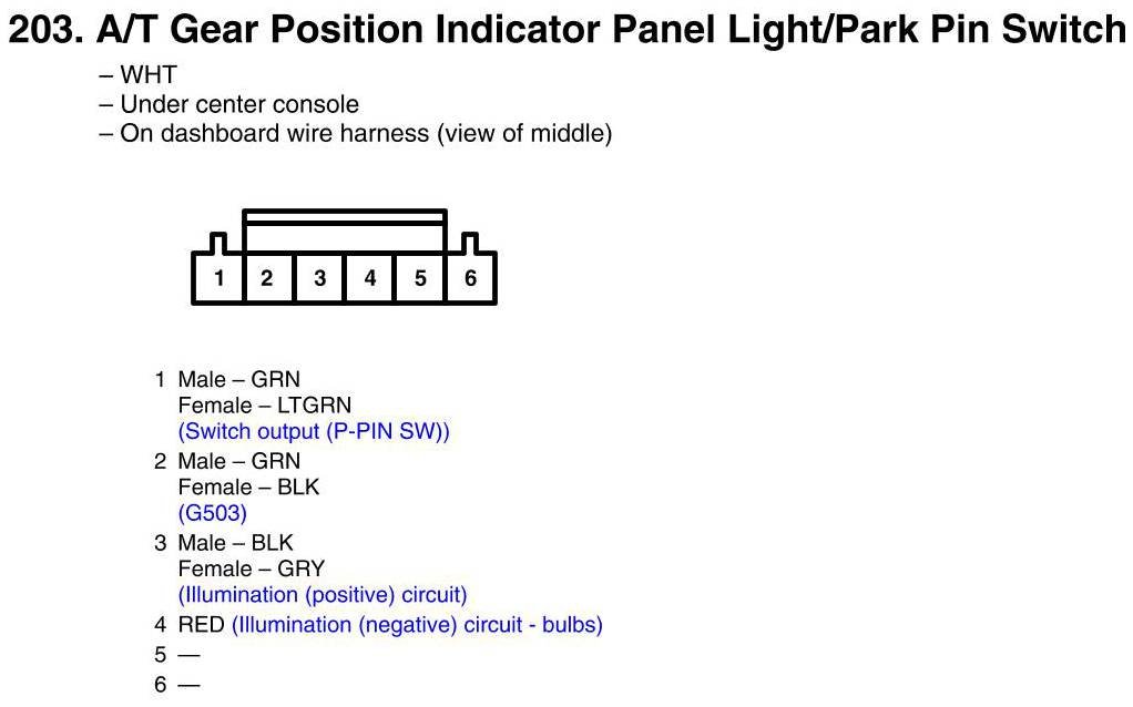 View 203 - A/T Gear Position Indicator Panel Light/Park Pin Switch Connector View