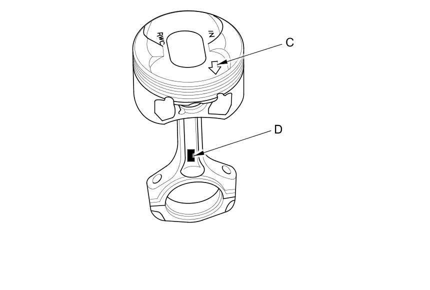 4. Assemble the piston (A) and the connecting rod (B) with the arrow (C) and the embossed mark (D) on the same side. Install the piston pin (E).