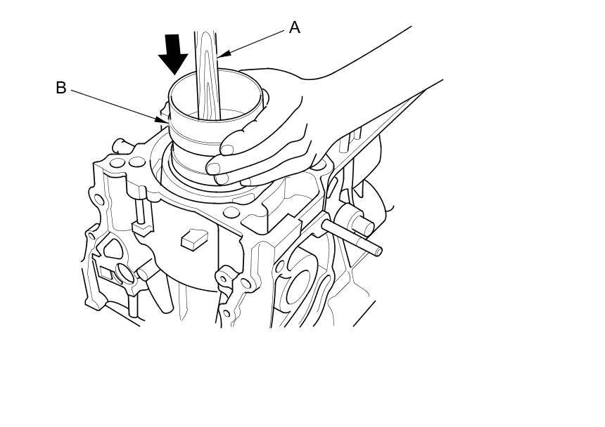 5. Position the piston/ connecting rod assembly in the cylinder, and tap it in using the wooden handle of a hammer (A). Maintain downward force on the ring compressor (B) to prevent the rings from expanding before entering the cylinder bore.