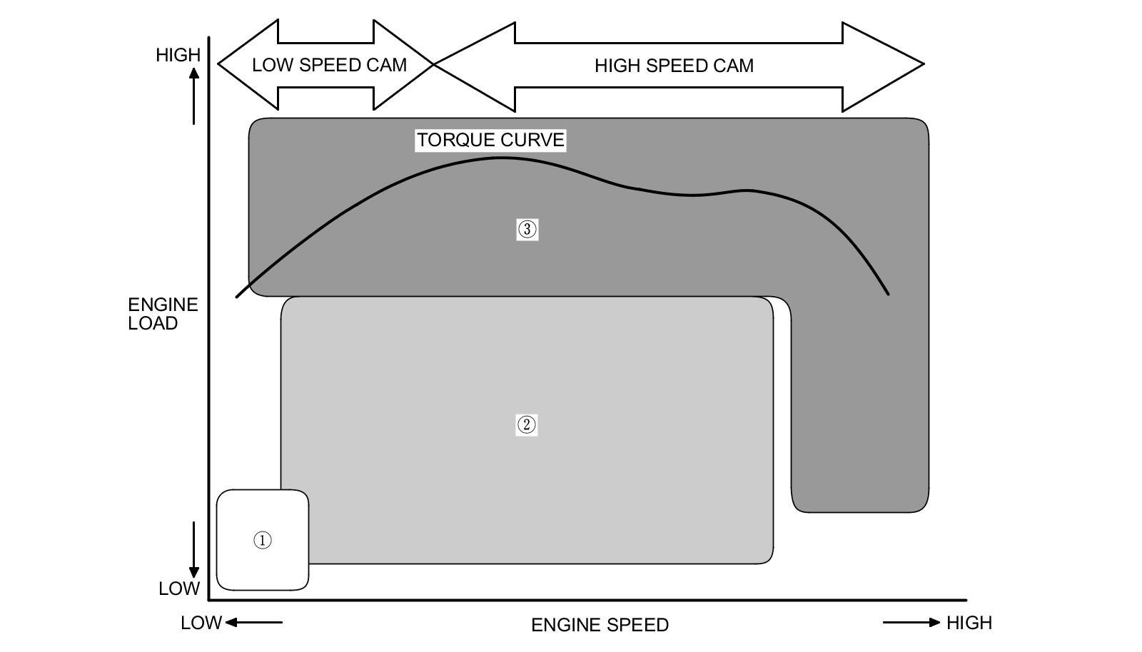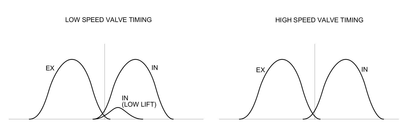 - The low lift cam is used by one side of the intake valves at a low engine speed. At high engine speed, both intake valves uses the high lift cam.