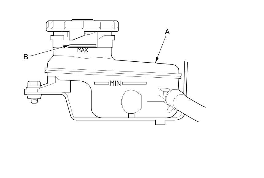1. Make sure the brake fluid level in the reservoir (A) is at the MAX (upper) level line (B).