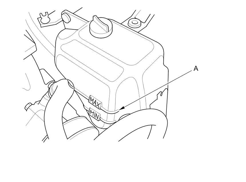 5. Fill the coolant reservoir to the MAX mark (A) with Acura Long Life Antifreeze/Coolant Type 2.