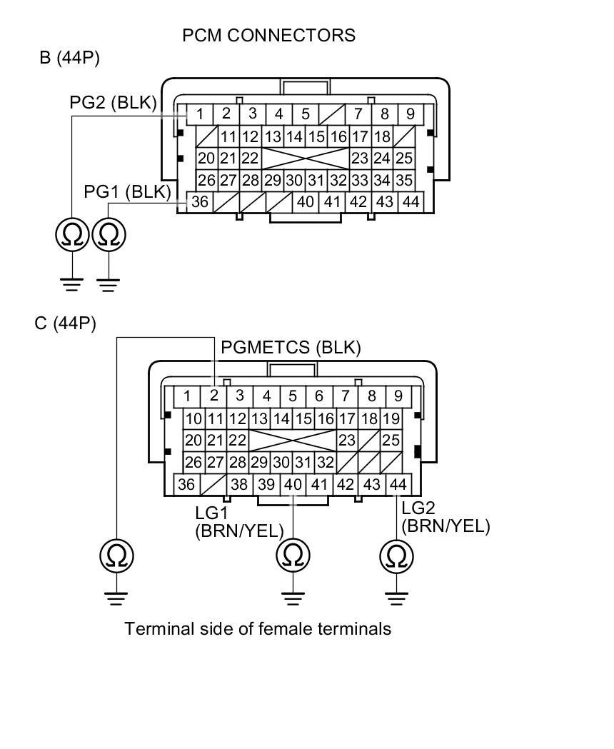 67. Check for continuity between body ground and PCM connector terminals B1, B36, C2, C40, and C44 individually.
