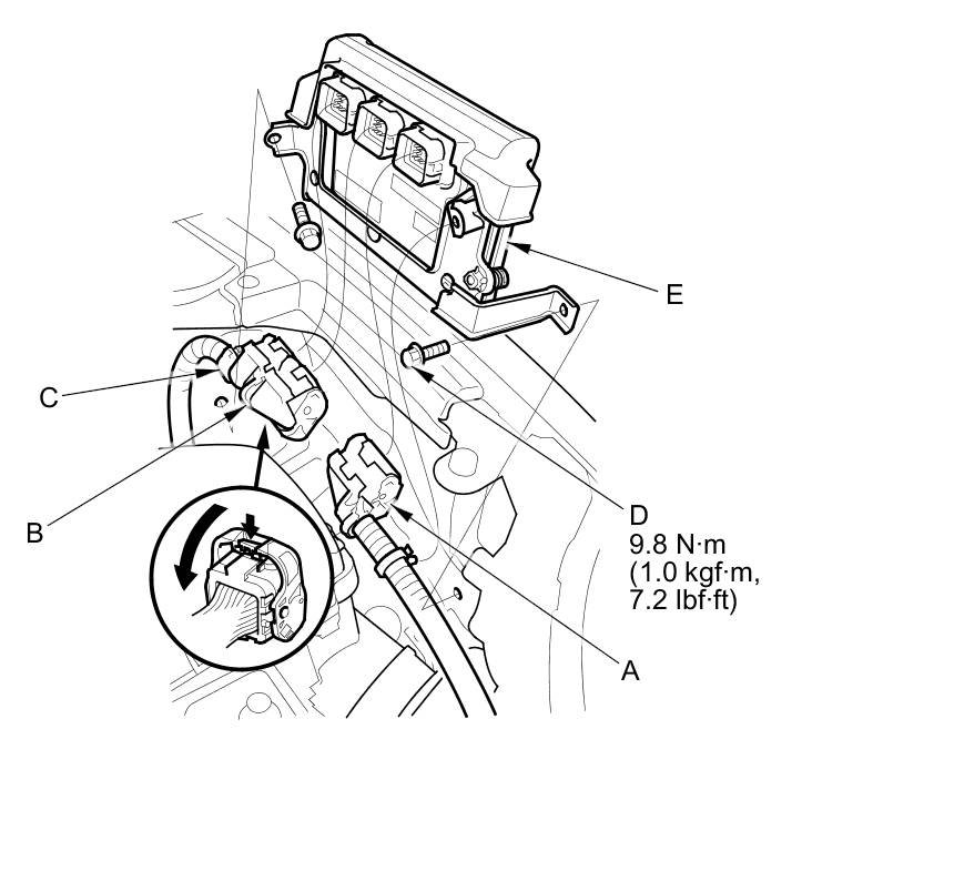 9. Remove the bolts (D), and remove the PCM assembly (E).