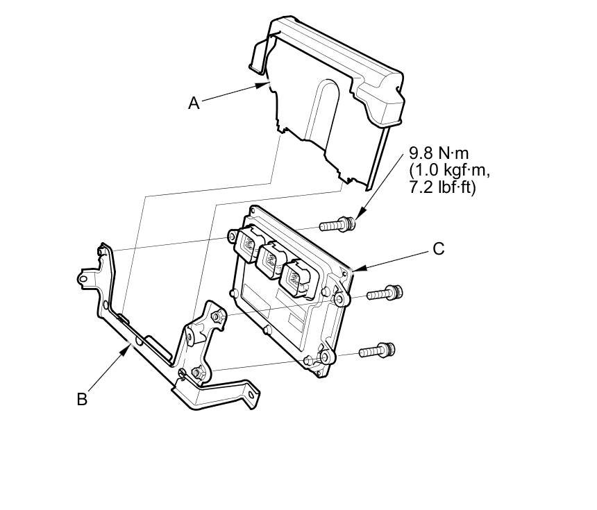 10. Remove the cover (A), and the bracket (B) from the PCM (C).