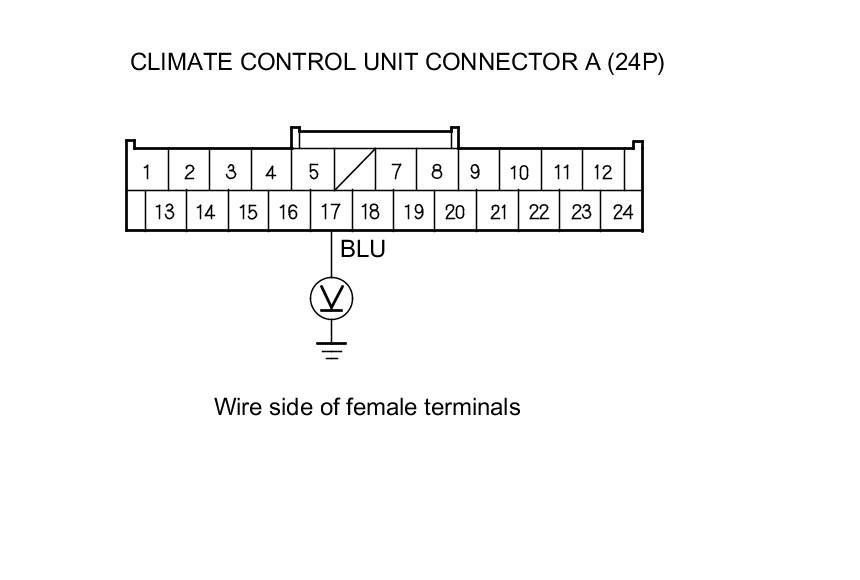 12. Measure the voltage between climate control unit connector A (24P) terminal No. 17 and body ground.