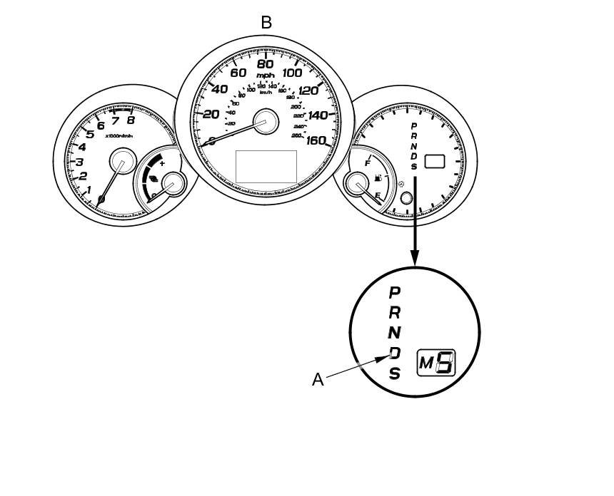 When the powertrain control module (PCM) senses an abnormality in the input or output system, the D indicator (A) in the gauge control module (B) will usually blink.