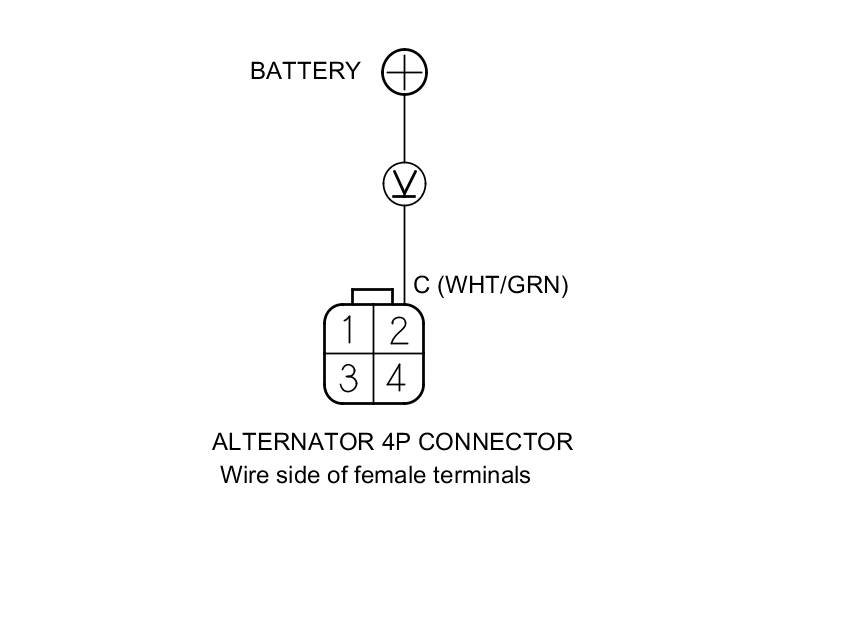 7. Measure the voltage between alternator 4P connector terminal No. 2 and the positive terminal of the battery.