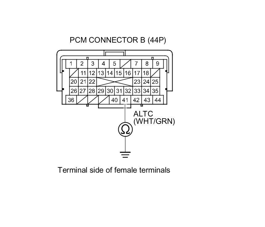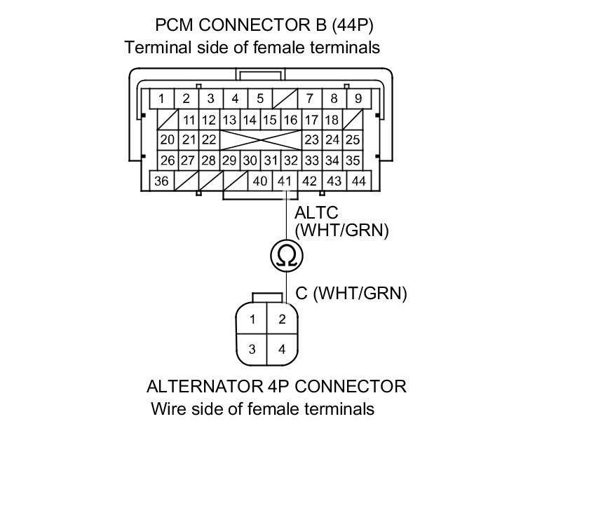 13. Check for loose terminals and connectors, then check for continuity between PCM connector terminal B41 and alternator 4P connector terminal No. 2.