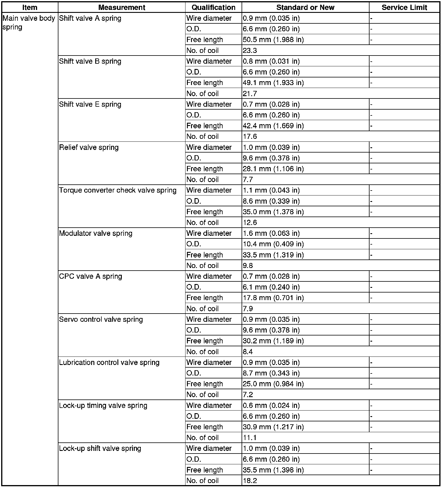 Main Valve Body Spring Specification(s)