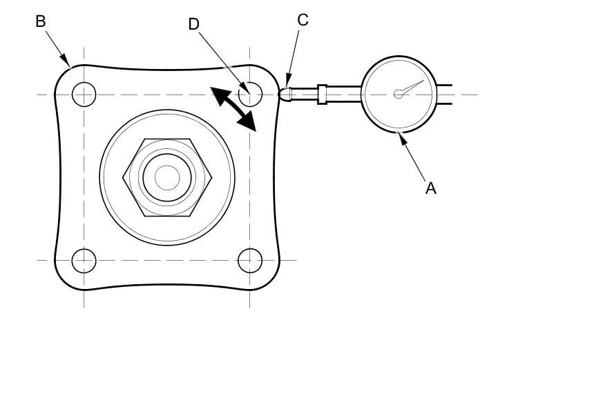 5. Set a dial indicator (A) on the transfer companion flange (B); position the dial indicator tip (C) on the direct extension of the bolt hole center (D).