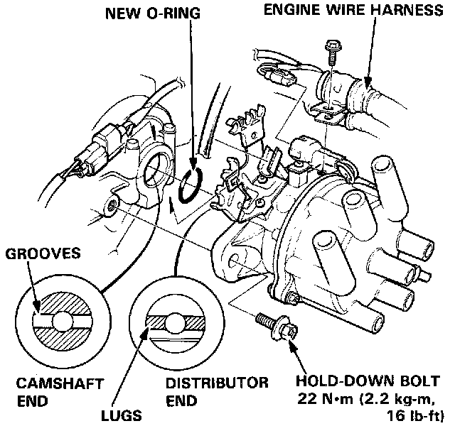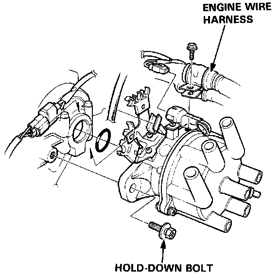 3. Remove the distributor hold-down bolt, then remove the distributor from the cylinder head.