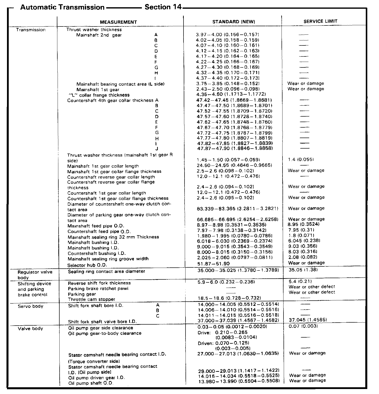 L5 4-spd A/T, Thrust Washer Thickness & Valve/Servo Body Clearance: