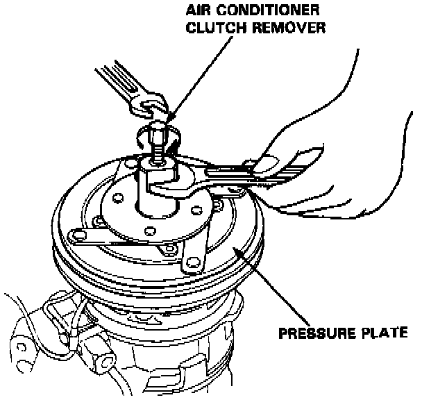 2. Thread the air conditioner clutch remover tool into the pressure plate and remove the pressure plate by screwing in the center bolt.