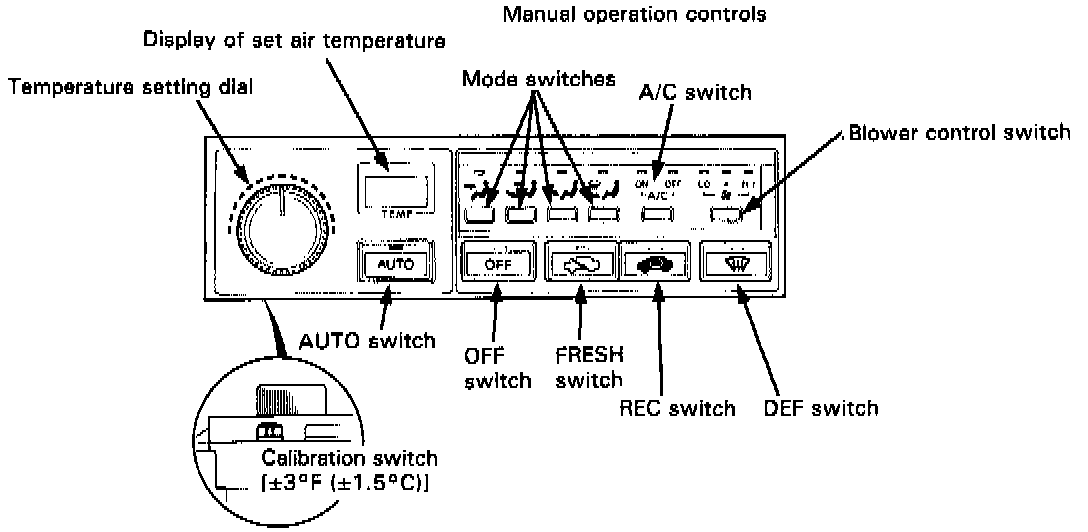 - If the DEF switch is pushed in the AUTO mode, the control unit selects the FRESH position, turns on the A/C system and regulates the blower speed automatically.