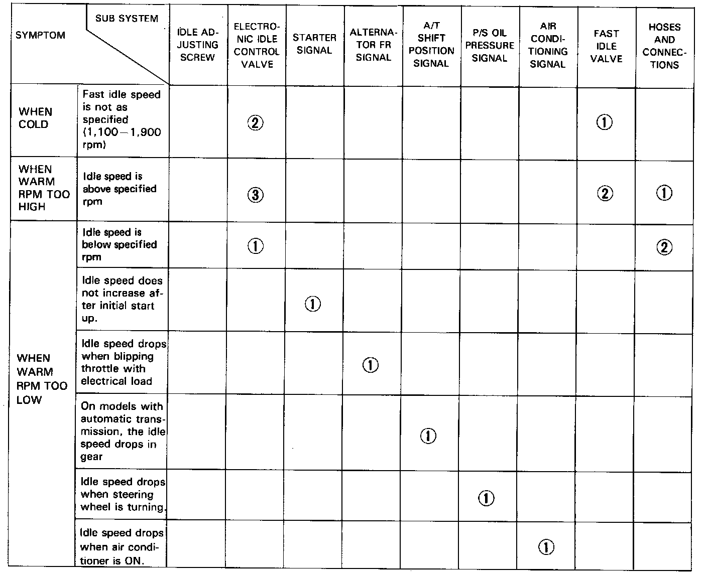NOTE: Across each row in the chart, the sub systems that could be sources of a symptom are ranked in the order they should be inspected, starting with (1). Find the symptom in the left column, read across to the most likely source, then refer to the system or component listed at the top of that column. If inspection shows the system is OK, try the next system (2), etc.