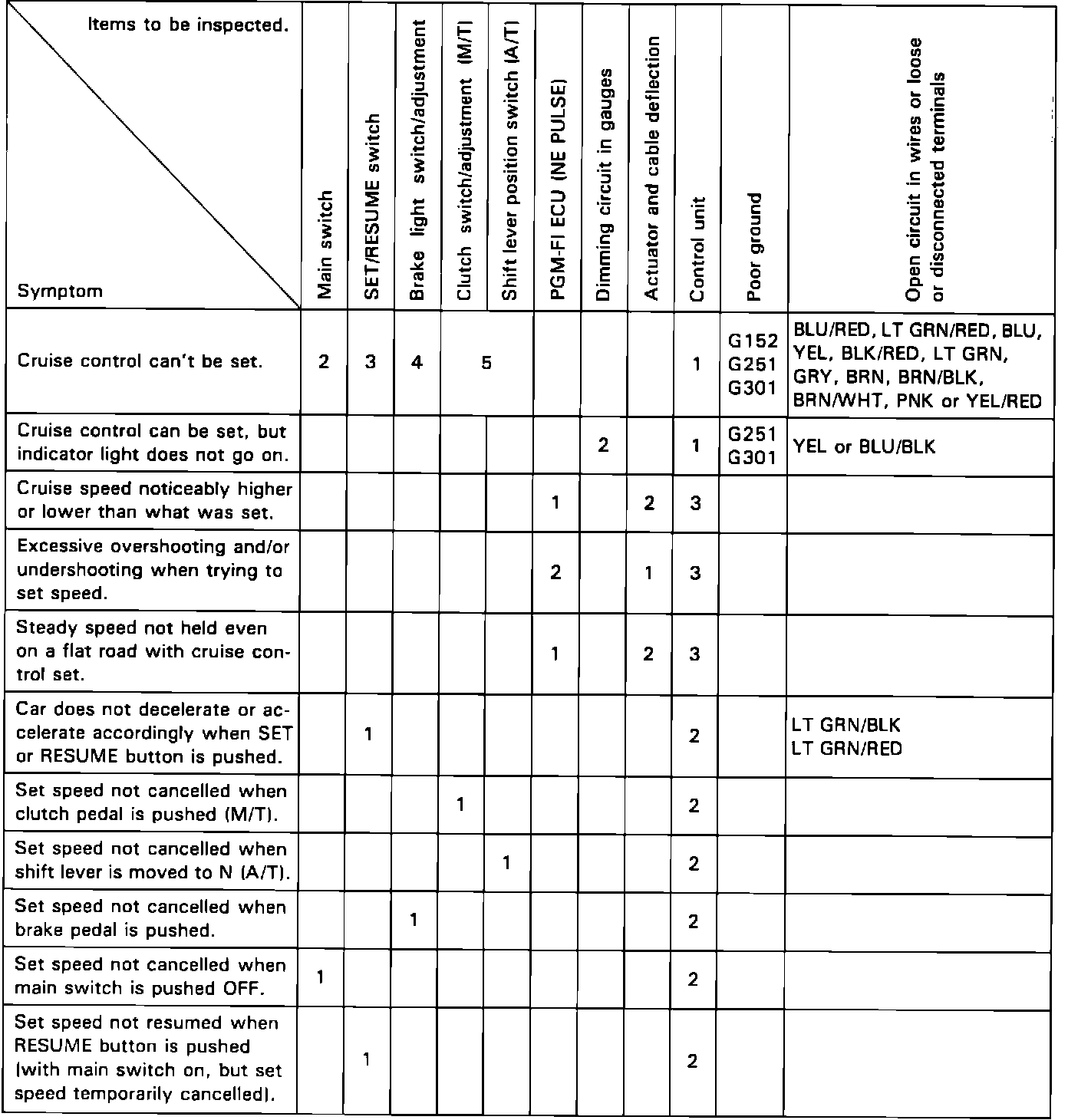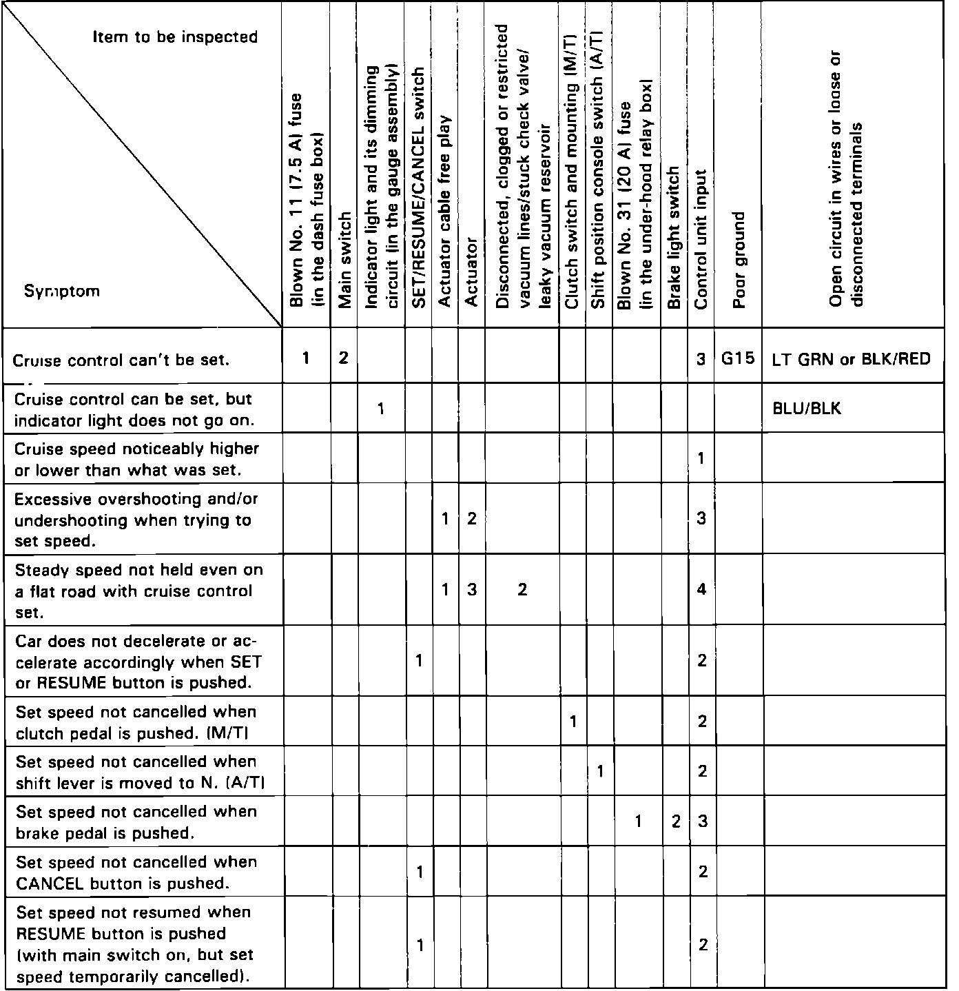 using numbers in the table following symptoms, as sequence with which fuse or unit may be at fault.