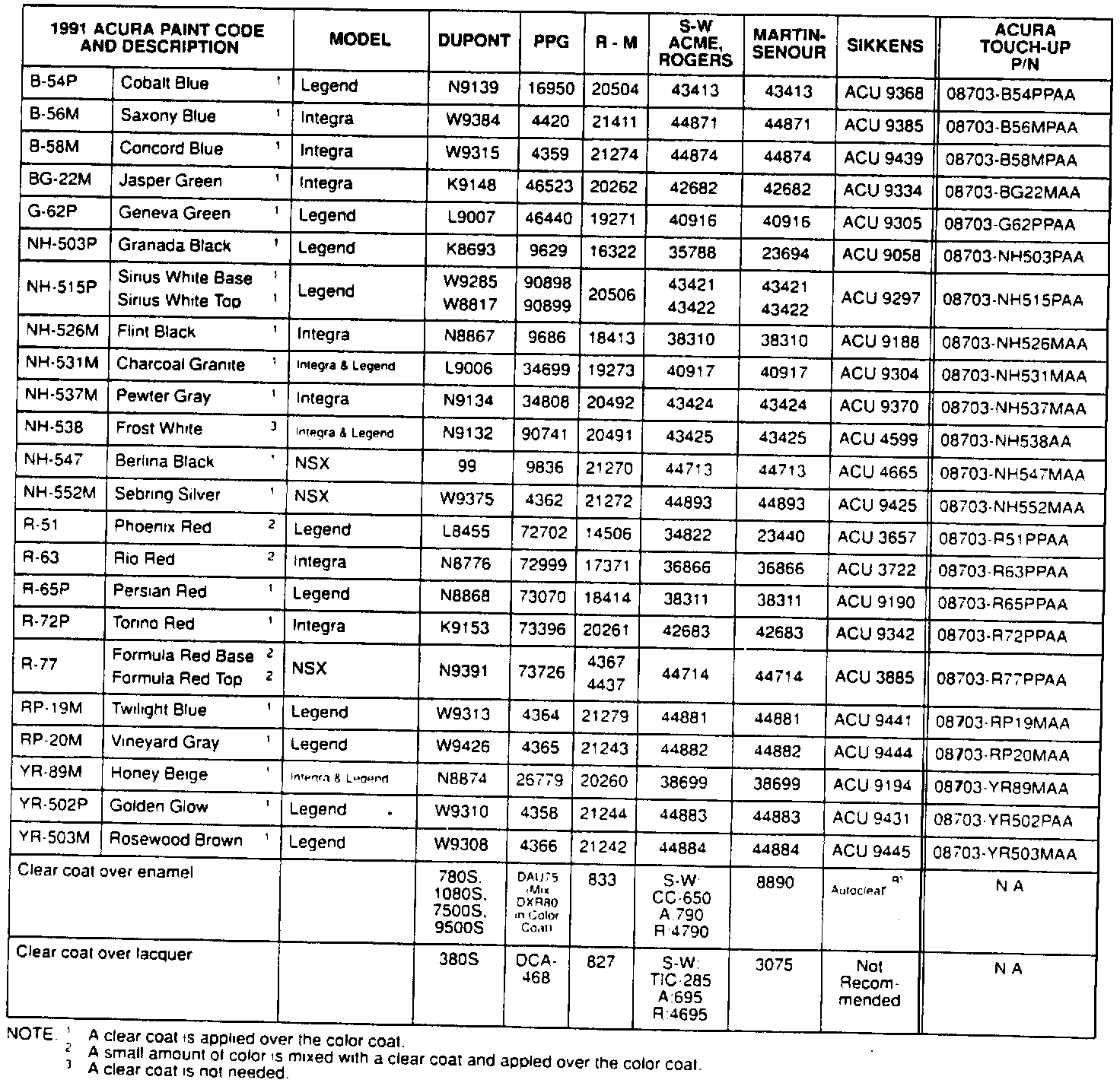 1991 Acura Paint Codes