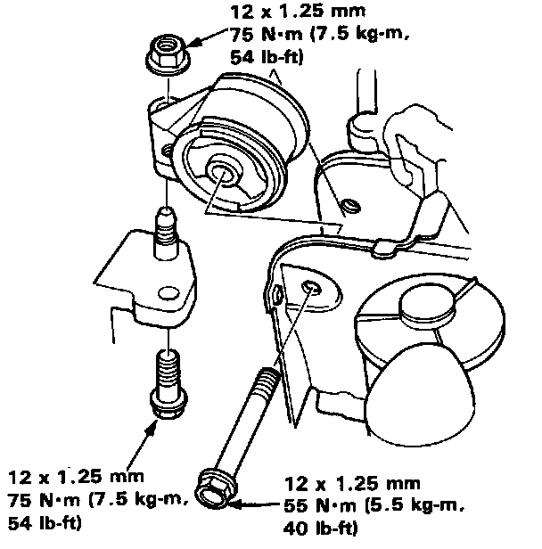 5. Remove the engine support bolts and nut, then remove the side engine mount.