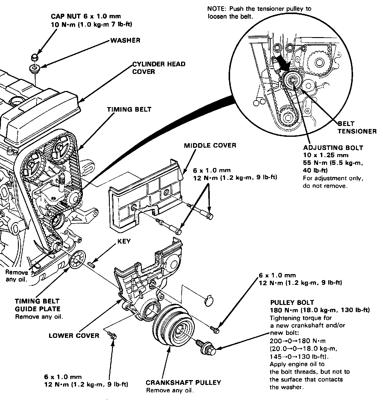 (1) tighten the crankshaft pulley bolt to 200 N.m (20 kg.m, 145 lb-ft)