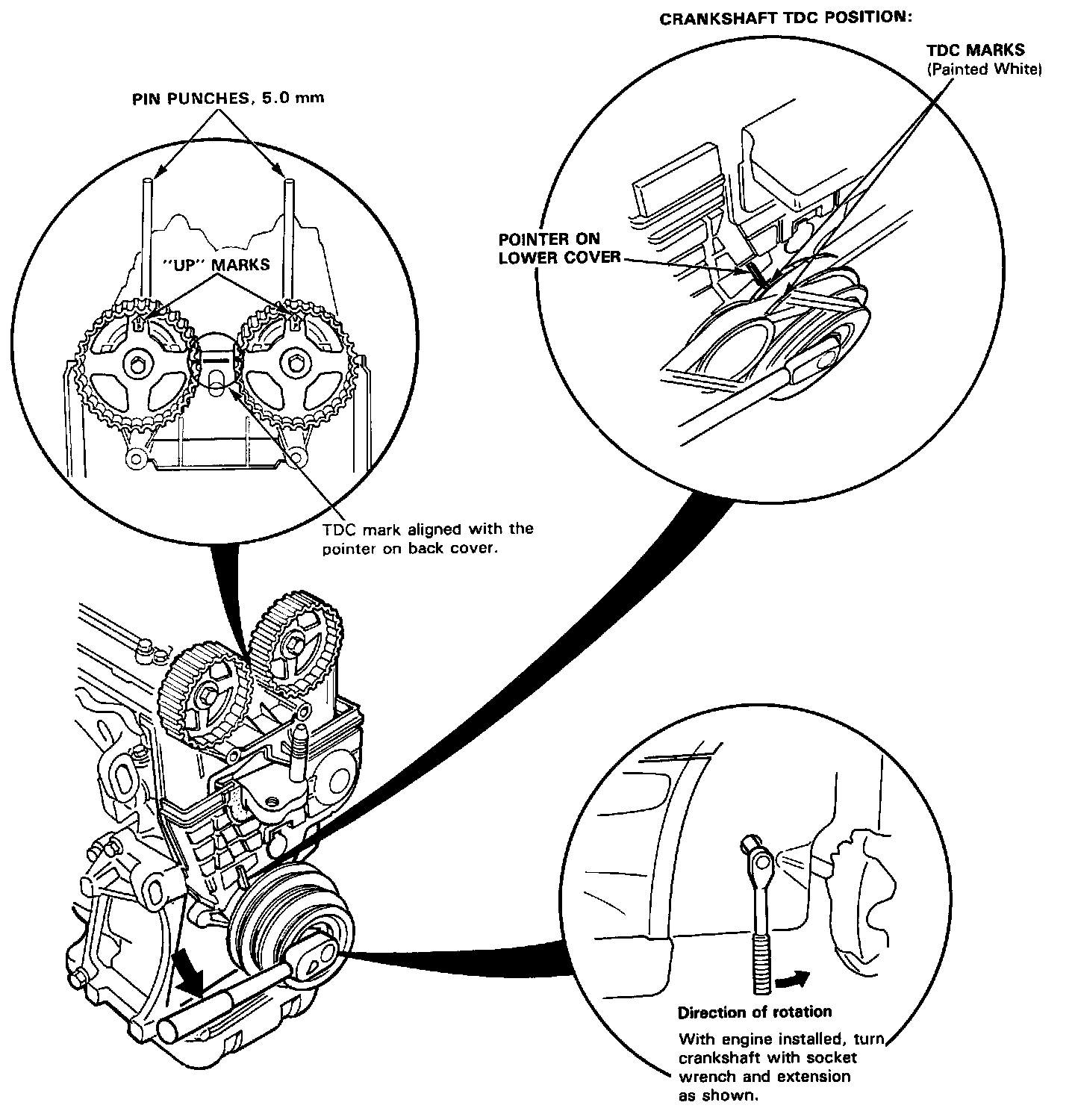 NOTE: To set the crankshaft to TDC, install the timing belt guide plates, timing belt drive pulley, timing belt lower cover. crankshaft pulley, and crankshaft pulley bolt.