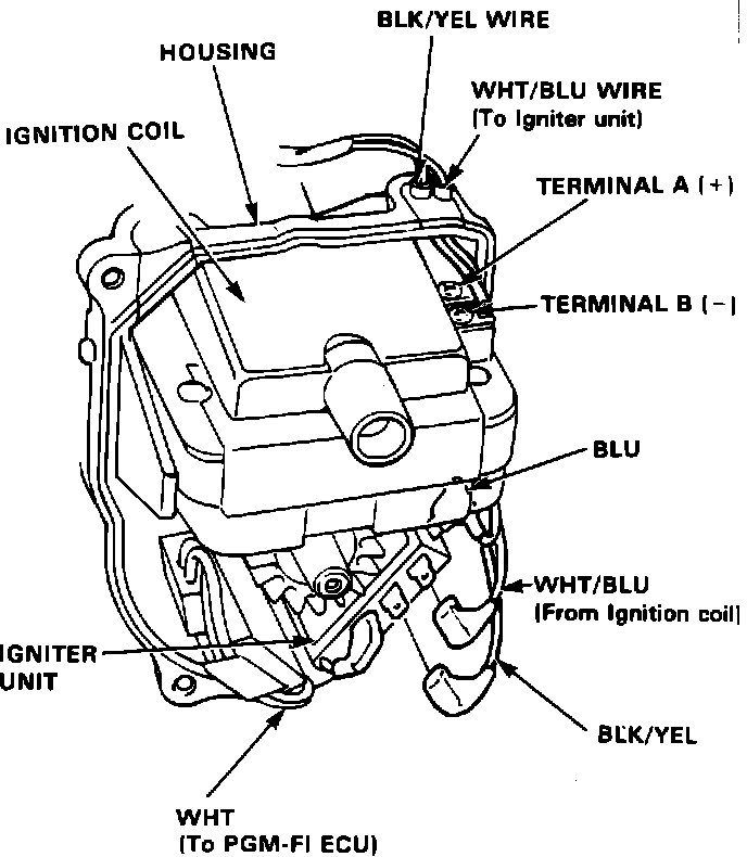 - If there is no voltage, check for an open in the BLK/YEL wire between the ignition coil and igniter unit, repair as needed.