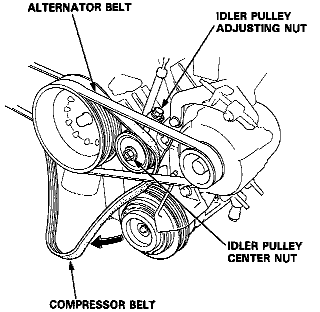 6. Loosen the idler pulley center nut and adjusting bolt, then remove the belt from compressor.
