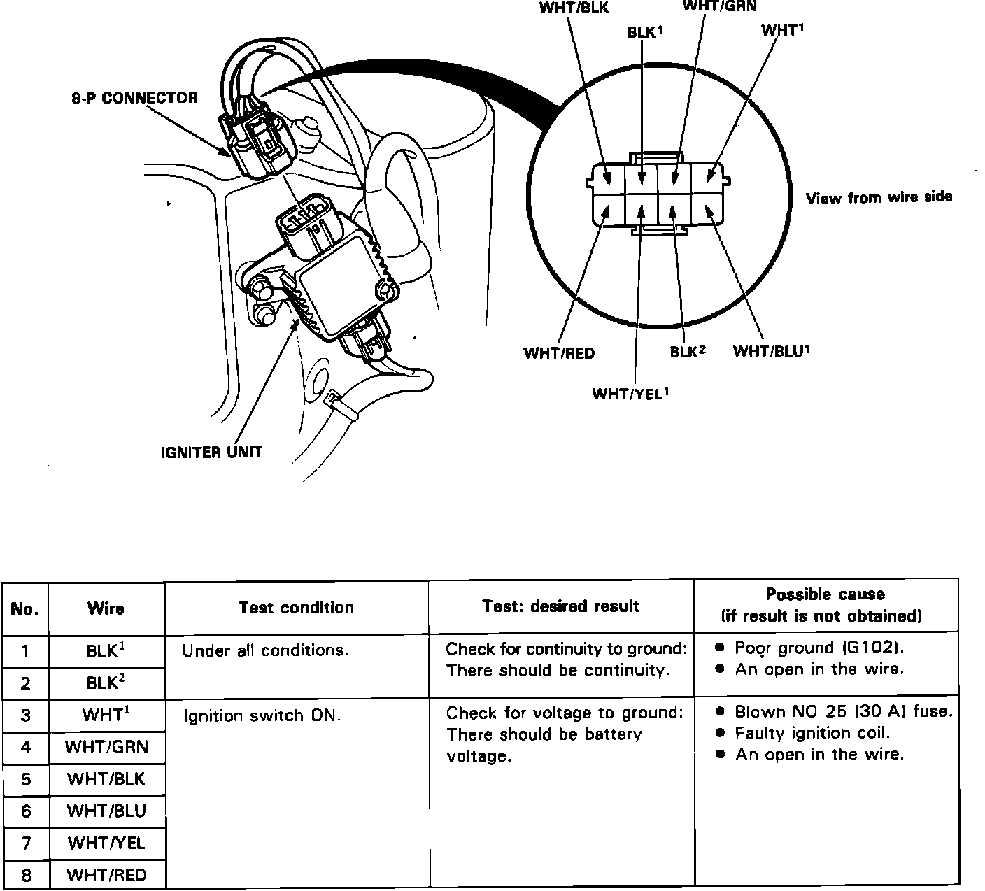 Disconnect the 8-P connector from the igniter unit. Make the following input tests at the harness pins. If all tests prove OK, yet the system still fails to work, replace the igniter unit.