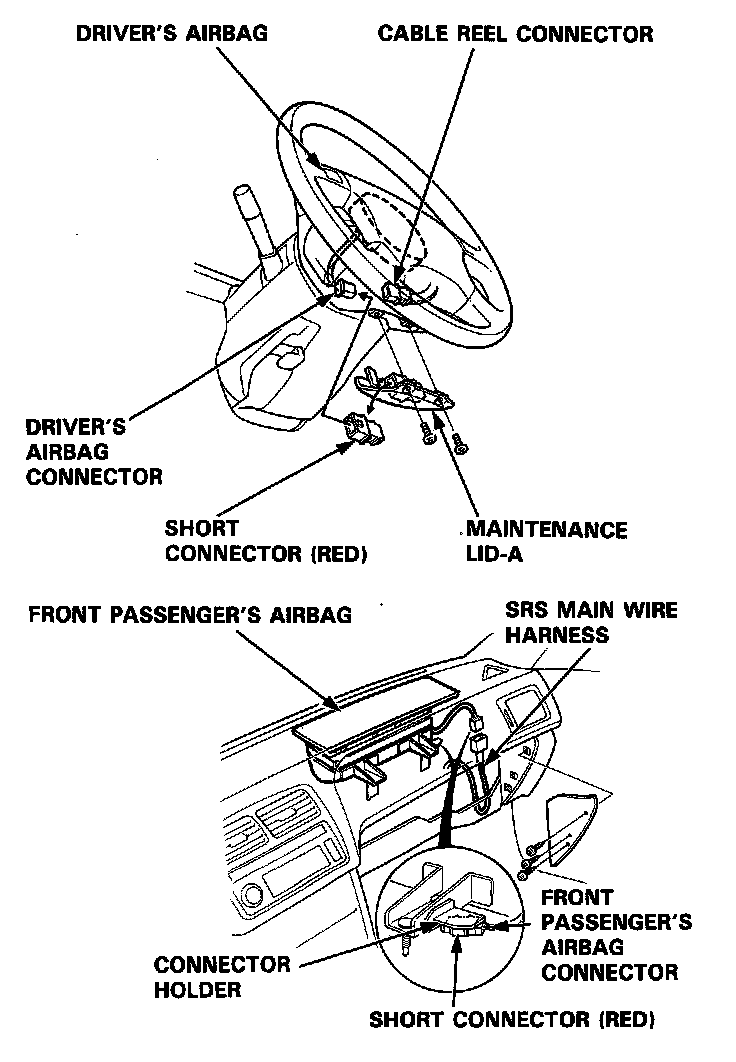 - Always keep the short connector on the airbag connector when the harness is disconnected.