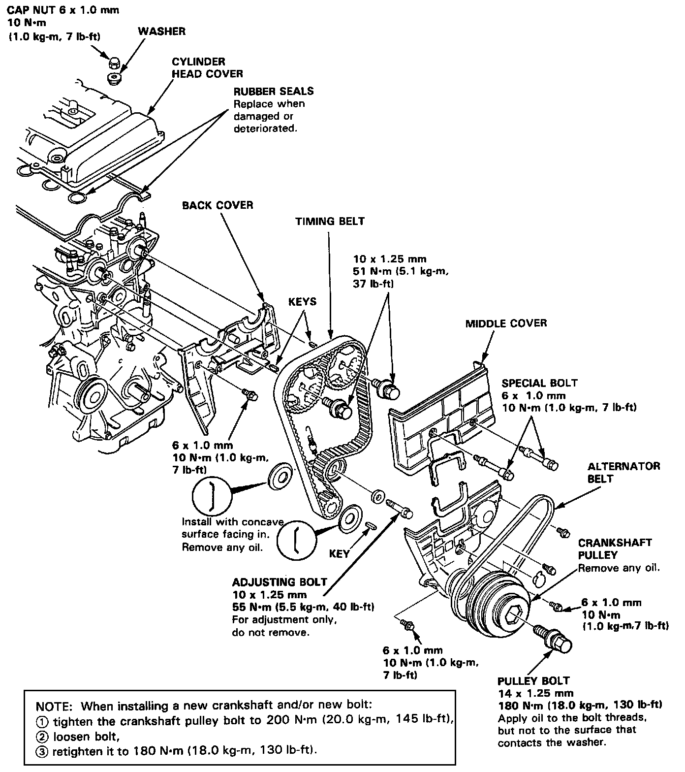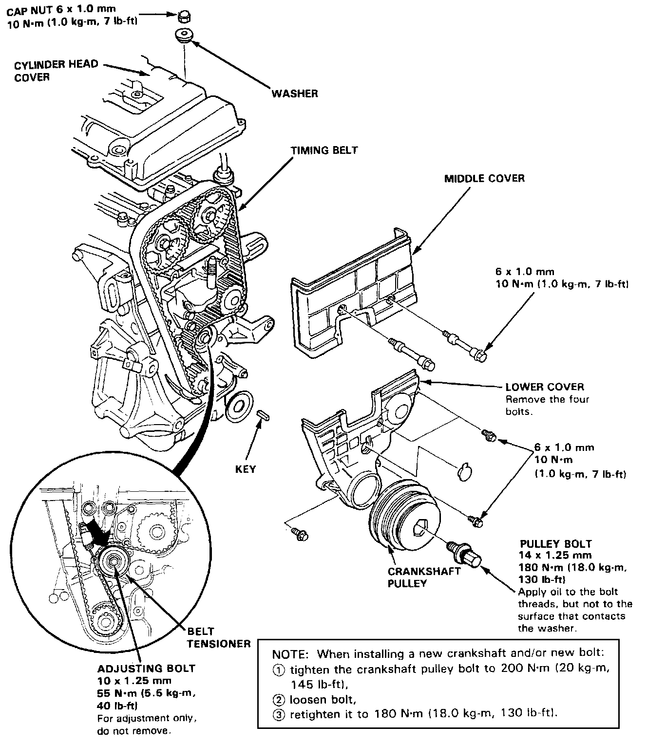 (1) tighten the crankshaft pulley bolt to 200 N.m (20.0 kg.m, 145 lb.ft)