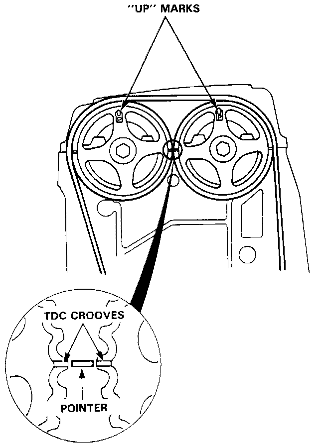 2. Position the crankshaft and the camshaft pulleys as shown before installing the timing belt.