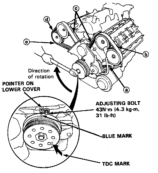 5. Tension the timing belt between the pulleys in the sequence A to E as shown. Refer to timing belt tension adjustment.