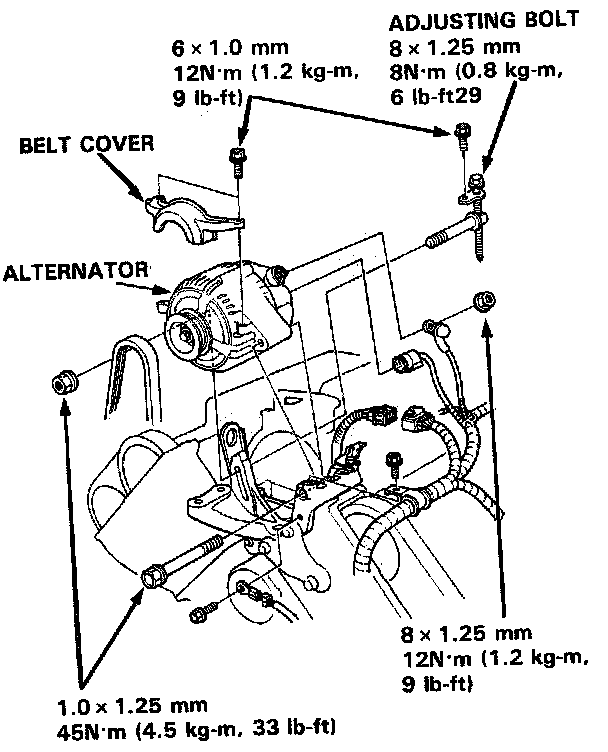 NOTE: Push the tensioner to release tension from the belt, then retighten the adjusting bolt.