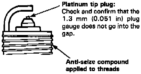 3. Make sure that the 1.3 mm (0.051 in) plug gauge does not go into the gap for the platinum tip plug. If the gauge goes into the gap, do not attempt to adjust the side electrode; replace the plug with a new one.