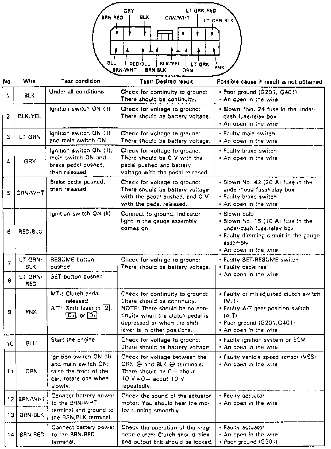 3. Disconnect 14 pin connector from cruise control unit, then inspect connector and socket terminals and repair as necessary.