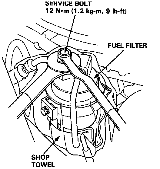 6. After work has been completed, tighten the service bolt on the fuel filter to 9 ft. lb.