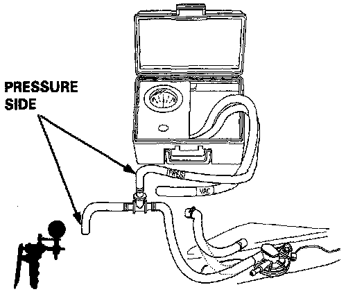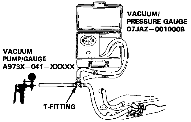 1. Remove the fuel fill cap.2. Remove vapor line from the two way valve on the fuel tank and connect to T-fitting from vacuum gauge and vacuum pump as shown.