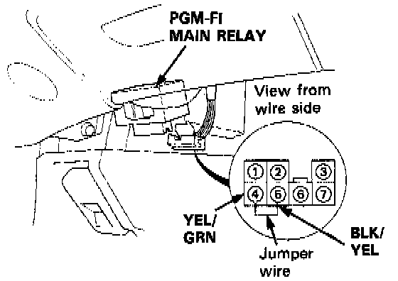4. Connect the BLK/YEL wire and YEL/GRN wire with a jumper wire at the PGM-FI main relay connector.