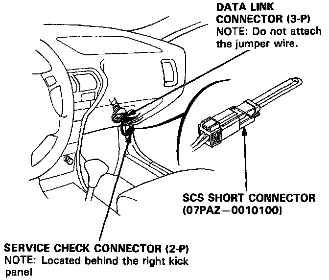 2. Connect the BRN/WHT and BLK terminals of the 2-wire Service check connector (SCS) located at right, under dash with the SCS short connector.