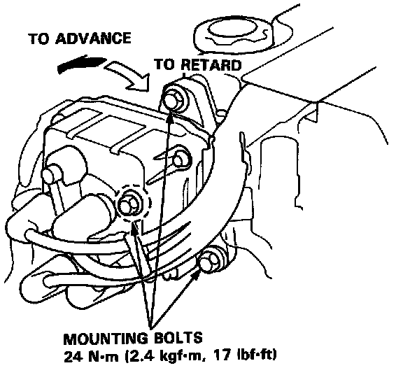 5. Adjust as necessary by loosening the distributor hold-down bolts and turning the distributor housing counterclockwise to advance the timing, or clockwise to retard the timing.