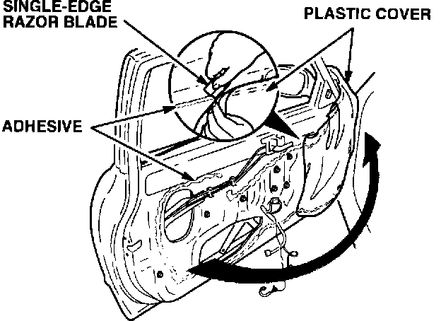3. Use a single-edge razor blade to cut the adhesive in the area shown; then, carefully pull up on the plastic cover (rain shield). Remove enough of the plastic cover to access the door glass regulator bolts.