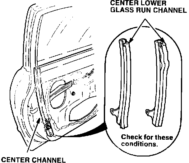 4. Temporarily reconnect the power window switch, and raise the window all the way up. Check to see if the center lower glass run channel in the center channel is properly positioned.
